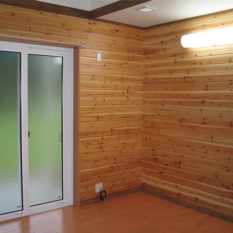 リビングは総板張りになっています。 玄関框には曲がり材を採用。