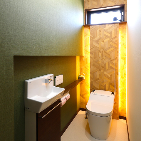 キッチンからは全体を見渡すことができ、家事をしながらお子様の様子もしっかり見ることができます。LDK壁面の間接照明とトイレ背面の間接照明はお施主様のこだわりポイントで素敵な空間です。