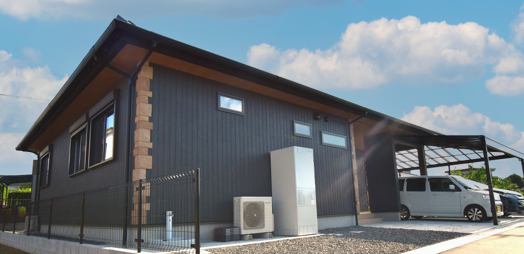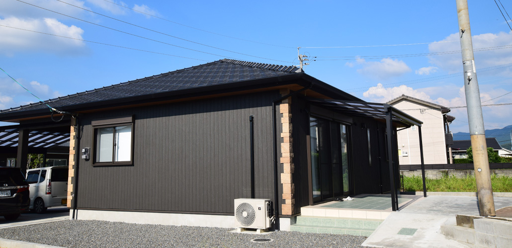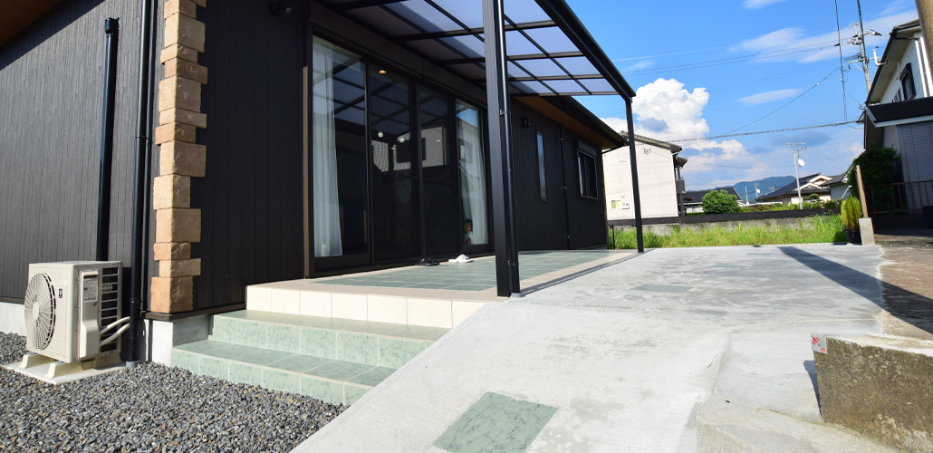 黒にアクセントレンガを施したシックな外観でありながら玄関アプローチは白のガーデニング石を用い少し可愛い感じを演出。LDKからフラットに設けた和室は白の扉で仕切れ、来客の時は扉を閉め、普段は開けて開放的に。