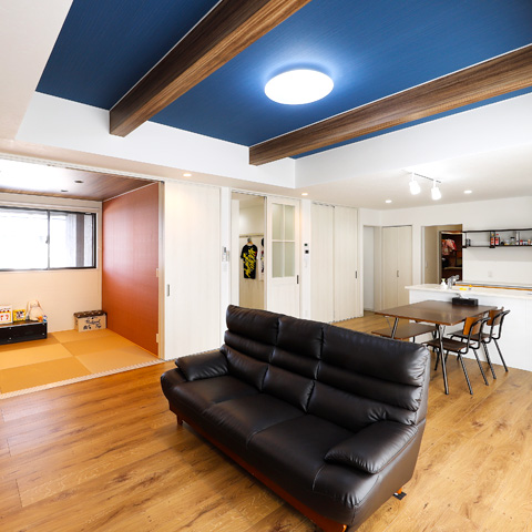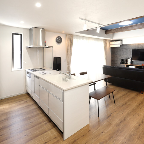 キッチンからは全体を見渡すことができ、家事をしながらお子様の様子もしっかり見ることができます。LDK壁面の間接照明とトイレ背面の間接照明はお施主様のこだわりポイントで素敵な空間です。